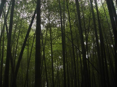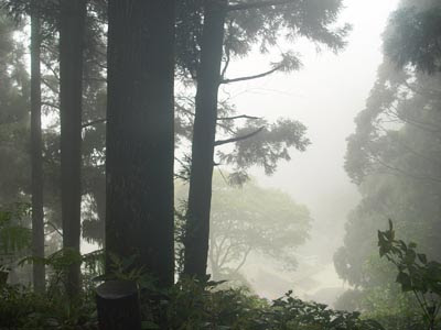 竹影扶疏,杉木聳立,棧道綿延,霧氣繚繞。